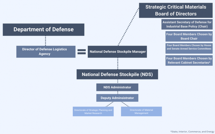 To reform the NDS, it is essential to first understand its structure. As part of the Department of Defense, NDS operations are overseen by the Director of the Defense Logistics Agency (DLA), who simultaneously serves as the National Defense Stockpile Manager. The NDS is also overseen by the Strategic Critical Minerals Board of Directors, chaired by the Assistant Secretary of Defense for Industrial Base Policy. With twelve other board members, the board of directors provides oversight and outlines strategy. Further down in the chain of command, the day-to-day logistics are overseen by an NDS administrator and deputy, who manage the agency’s strategic stockpiles.