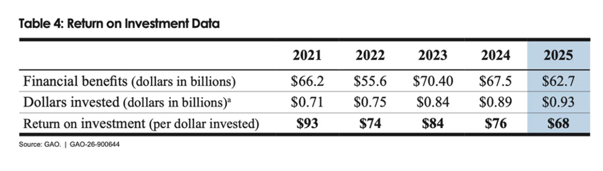 These three goals are urgent because GAO's own performance metrics reveal institutional drift. Over the past five years, GAO's return on investment has declined compared to its 10-year average ROI of $116 for every dollar provided by Congress. Without baseline data on what is causing this decline, the next Comptroller General will inherit a problem without a diagnosis.