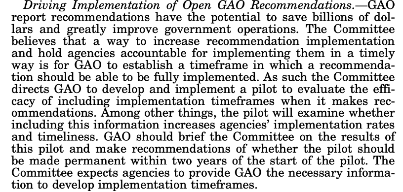 In 2024, the House Appropriations Committee included the following language in its report accompanying the funding bill that includes GAO to require a pilot project to establish timeframes on new GAO recommendations. The pilot project was supposed to be made permanent within two years. But 20 months later, there’s no evidence that this pilot project has happened.