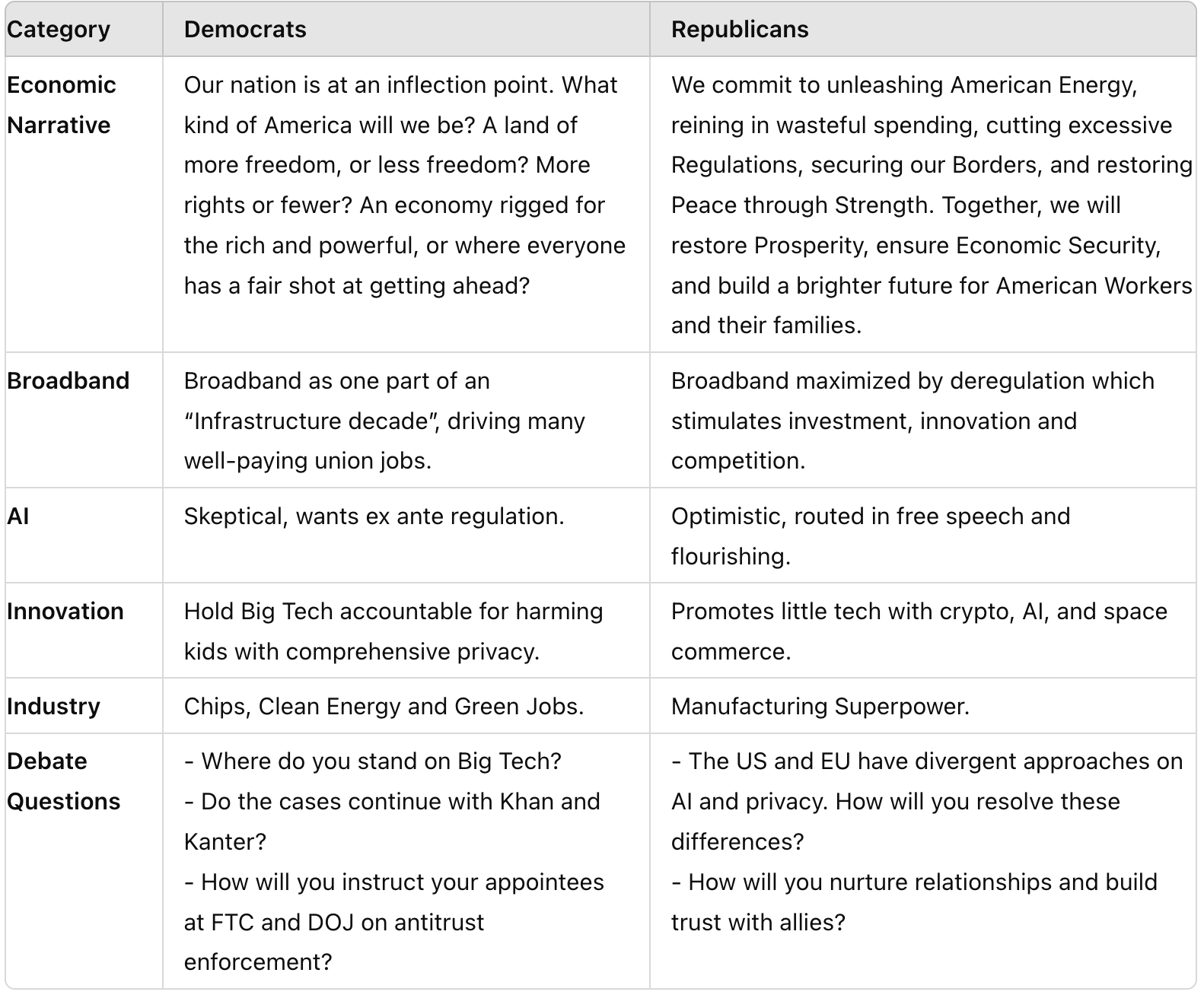 Meanwhile, the GOP bills itself as the party of innovation and Little Tech, reclaiming salted ground from the techlash. Similarly, the parties promote different industries. For Democrats, it’s about chips and Green Energy. Republicans pledge to make the USA a Manufacturing Superpower. (Check out John Gardner’s Manufacture Local for the blueprint on revitalizing manufacturing and its benefits for workers, security, the city, and nation.) Title II net neutrality was a pillar of the DNC for years, but there is no mention of it in 2024.