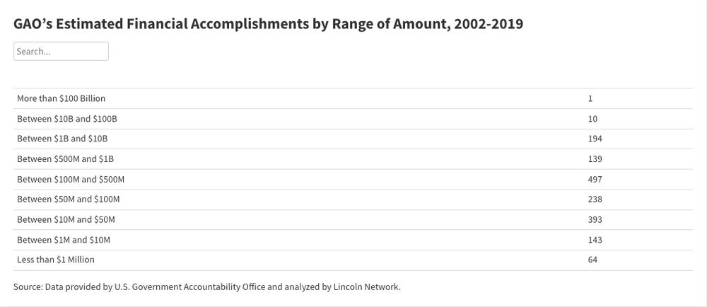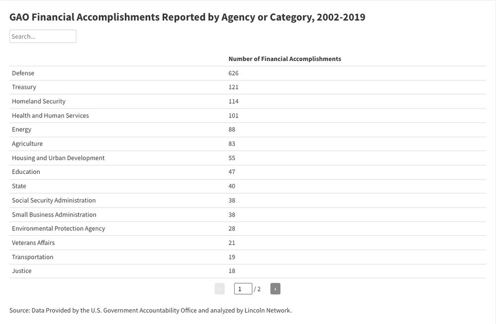 This article presents an analysis of nonpublic data provided by GAO to Lincoln Network showing all estimated financial accomplishments from 2002 to 2019. GAO provided this data at Lincoln Network’s request as a follow up to my 2020 report. Between 2002 and 2019, GAO recorded 1,679 financial accomplishments totaling more than $1.1 trillion in savings. A public copy of the data table that GAO provided to Lincoln Network is available is below.